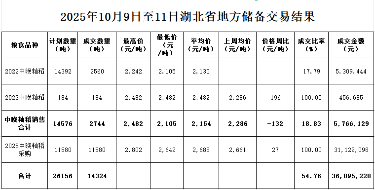 本周(2025年10月9日—10月11日)湖北無國家政策性糧食投放。